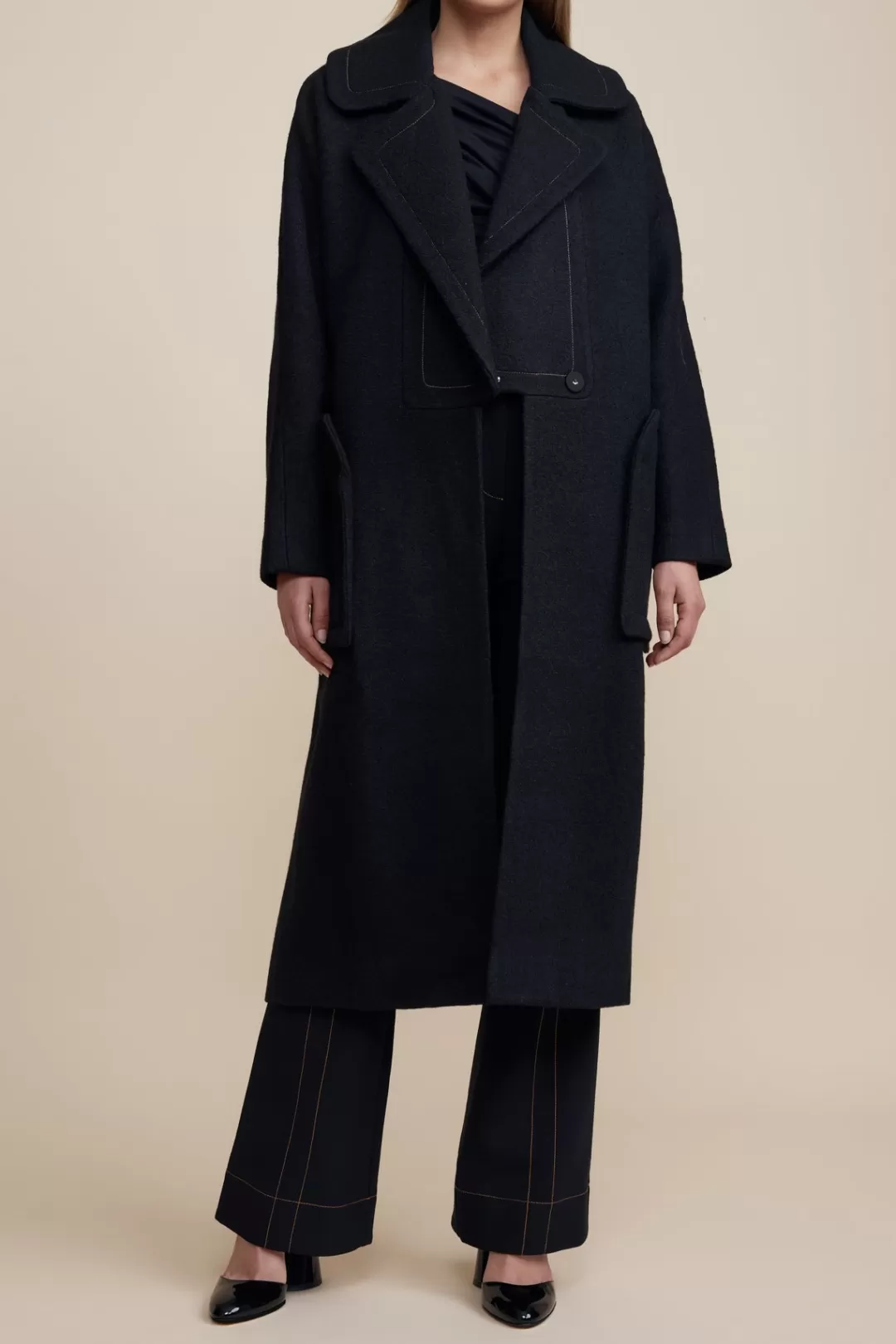 The Gladstone Coat In Black Is A Piece For Your Forever Wardrobe, Crafted From A Wool Blend Fabrication, This Silhouette Offers Warmth And Versatility. Functional Front Pockets, Removable Waist Tie, Internal Snap Closure And Double Lapels. Perfect For Layering On Cooler Days.