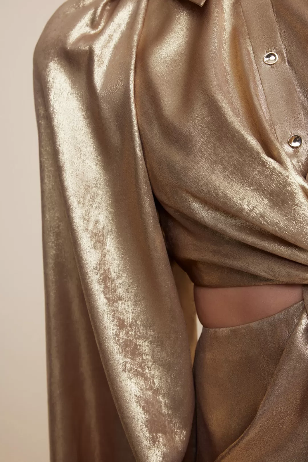 The Woodward Dress In An Elevated Gold Colour Way Is A Refreshing Take On The Classic Mini Dress Silhouette. Full Length Sleeves, Collared Neckline, Twisted Fabrication Detail At The Waist And Side Bodice Cut Outs.